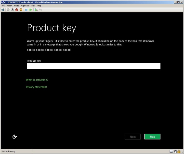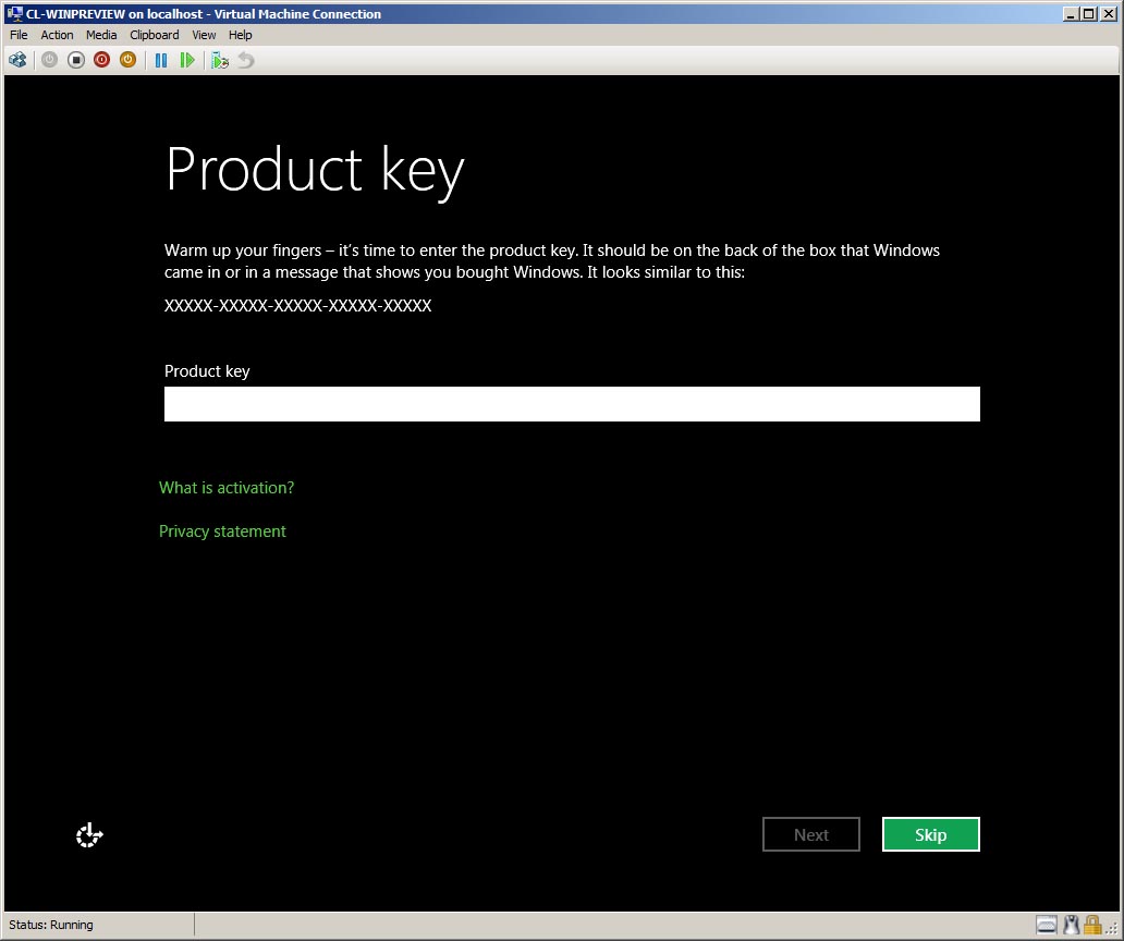 Skip the Product key page as this will be automatically be activated after the setup is completed (provided you are connected to the Internet)