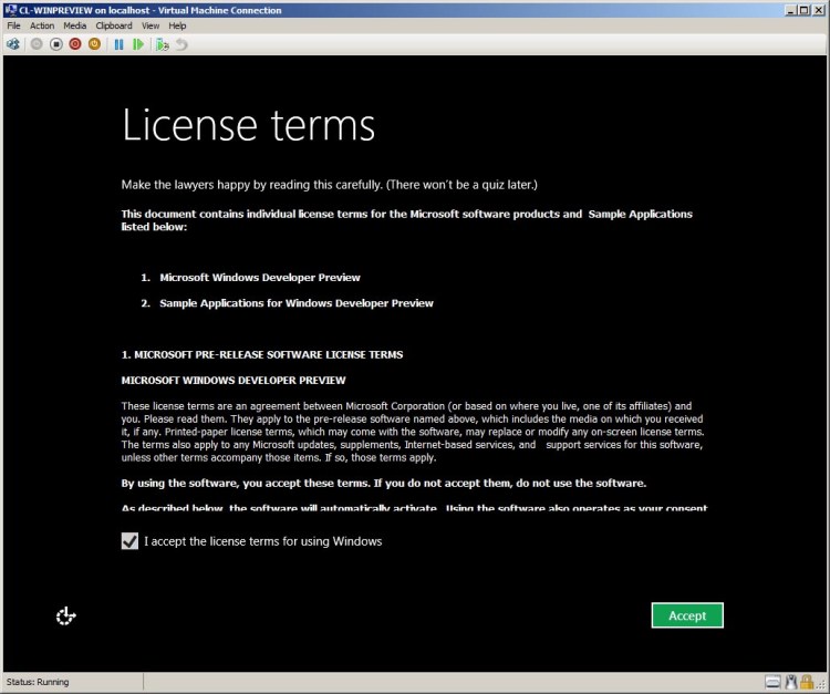 Tick the “I accept the license terms for using Windows” box and click the Accept button to continue