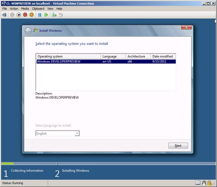In the next screen under Operating system, the  Windows DEVELOPERPREVIEW is already selected. Click Next to continue.