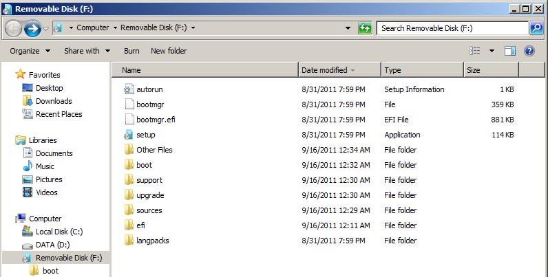 In the image above shows the copied Windows 8 files in my bootable thumb drive and the Other Files folder is where I moved the Windows 7 installation files.
