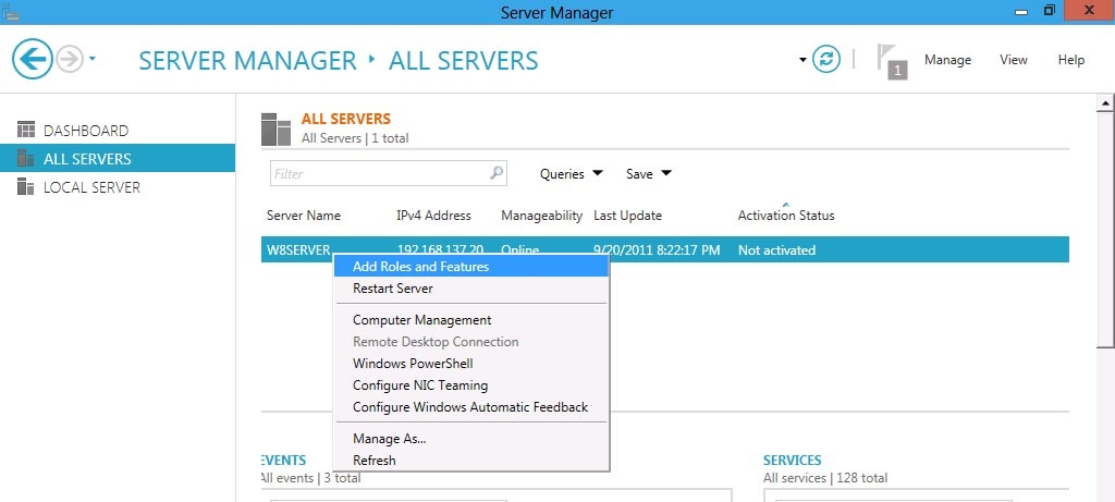 There are several methods to add roles from the Server Manager. In this scenario: right-click a server where you will install a certain role under All Servers then select Add Roles and Features.