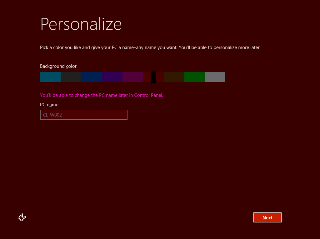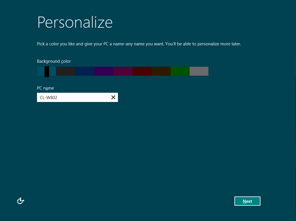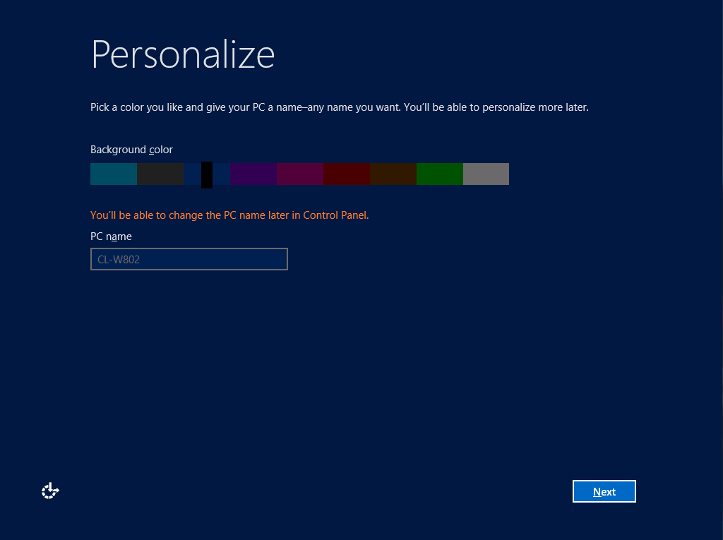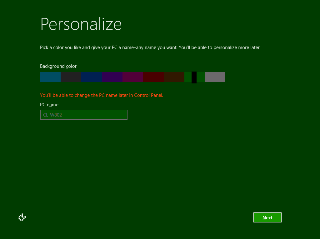 In the Personalize screen you you can select the background color of your choice and then giving your PC a name.