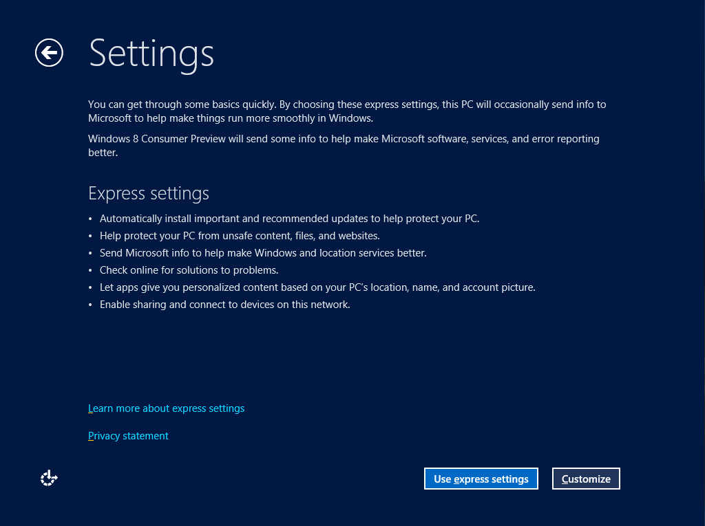 Here are several screen shots in applying the final settings to Windows 8 Consumer Preview during your installation.