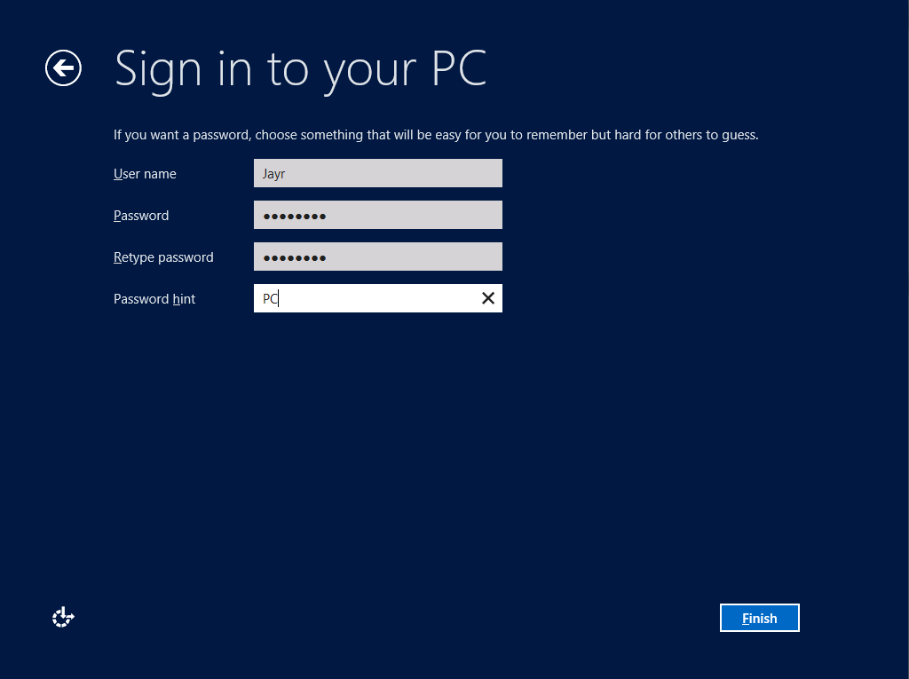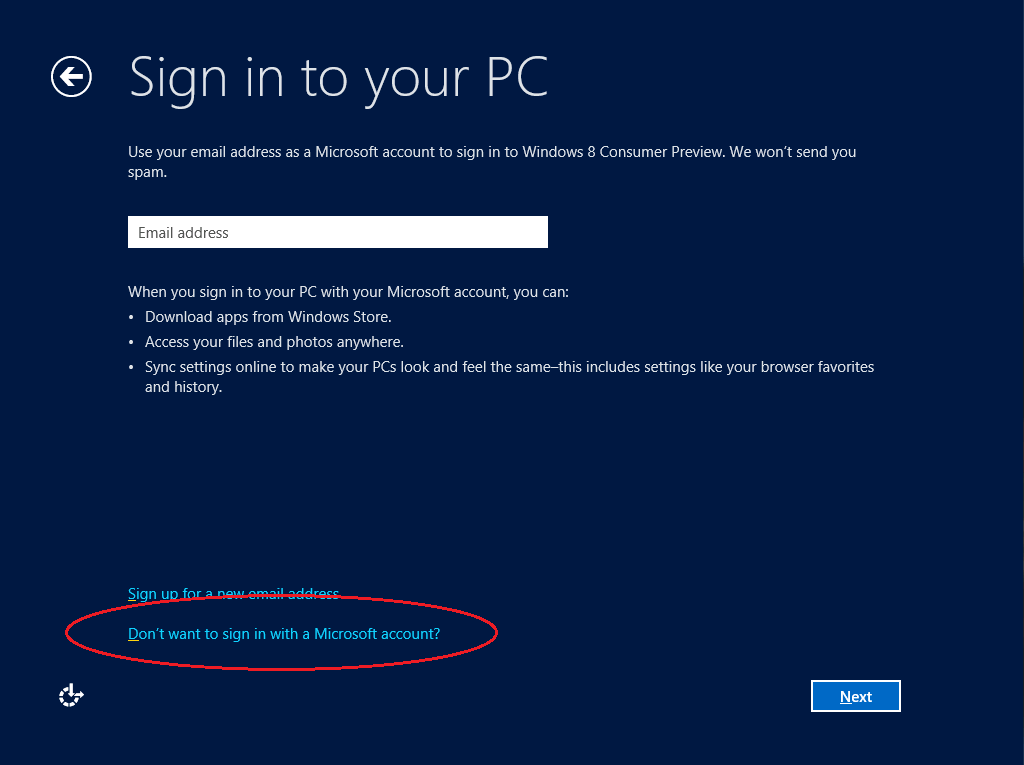 If you choose not to sign in with your Microsoft account select the Don’t want to sign in with a Microsoft account option. This will not sync up with your online accounts such as live mail and downloading apps from Microsoft store will require you to setup or sign in with a Microsoft account.
