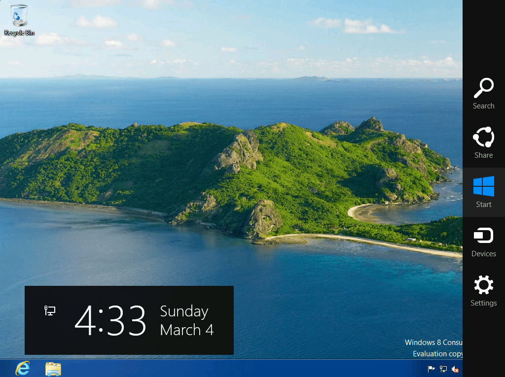 Hover your mouse to the upper right corner of your desktop to access Search, Start, Devices and Settings.