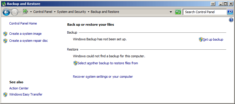 In Windows 7, access Backup and Restore from Control Panel\System and Security.