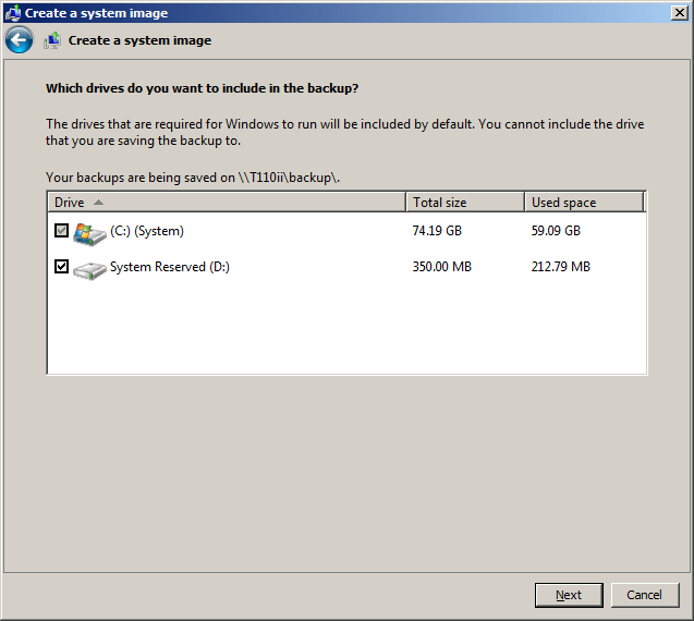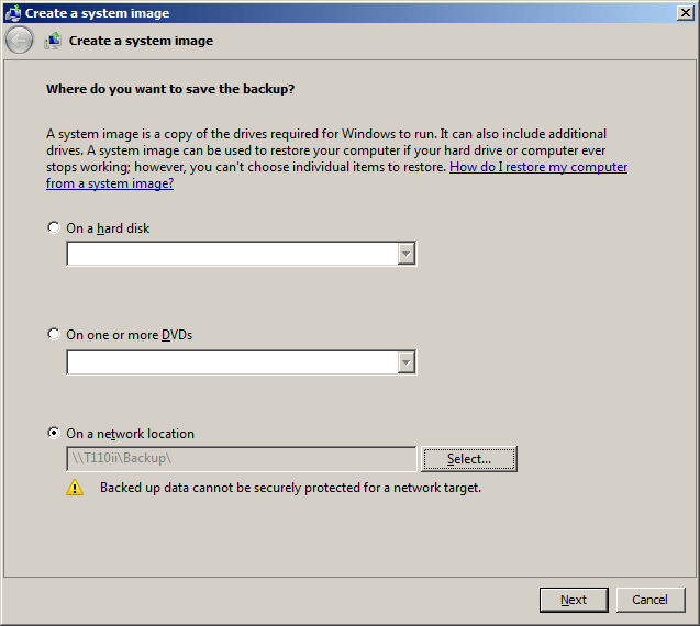The Create an system image windows will pop up and it will ask you where to you want back up your image. In this example I have selected to store the system image in a network share. Hit the Next button to continue.