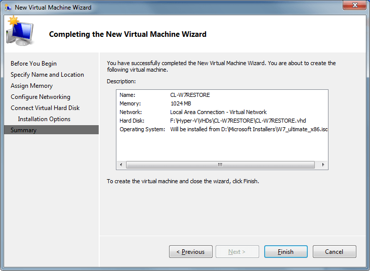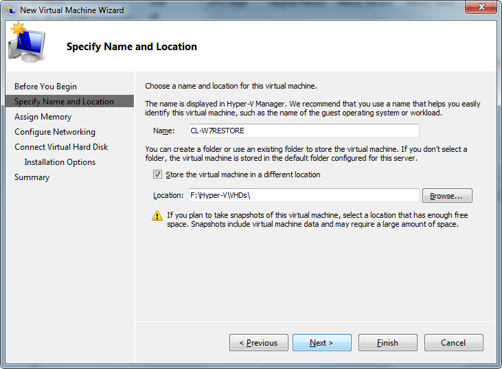 In my Hyper-V environment I created a new virtual machine and named it as CL-W7RESTORE.