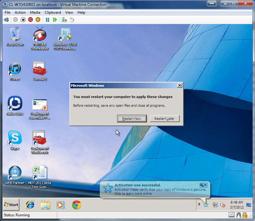 Windows 7 will be automatically reactivated upon log in and will ask your to restart your newly re-imaged virtual machine.