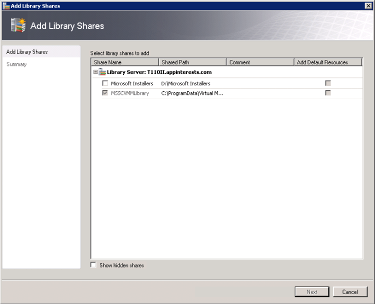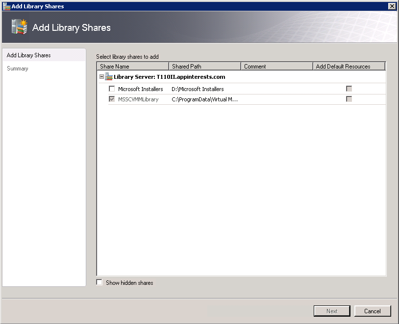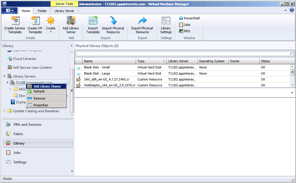 Under the Library Servers in the left pane list, right click the Server host that has a shared folder containing the ISO files and select Add Library Share.
