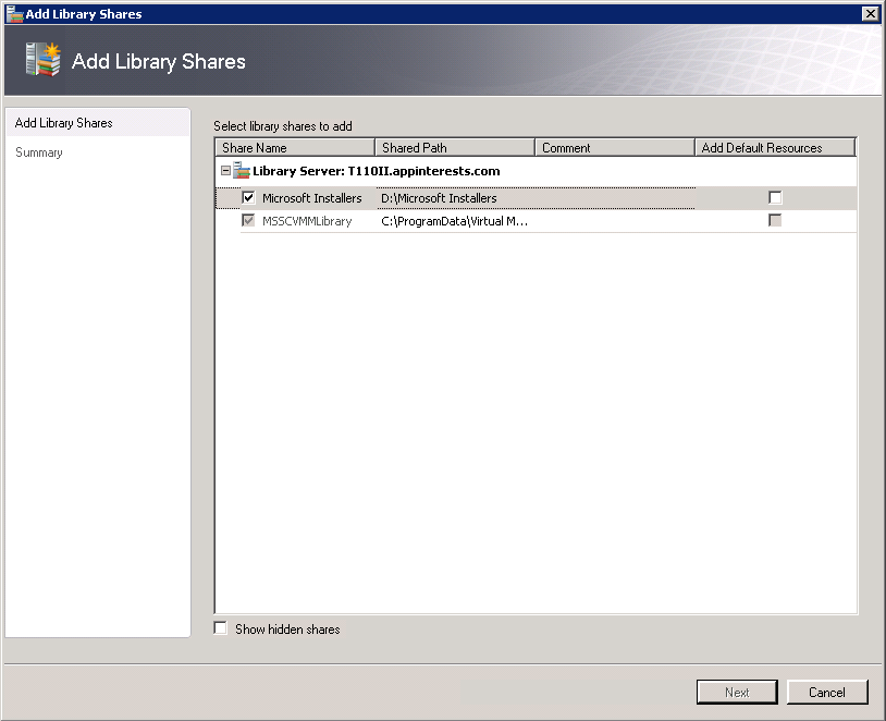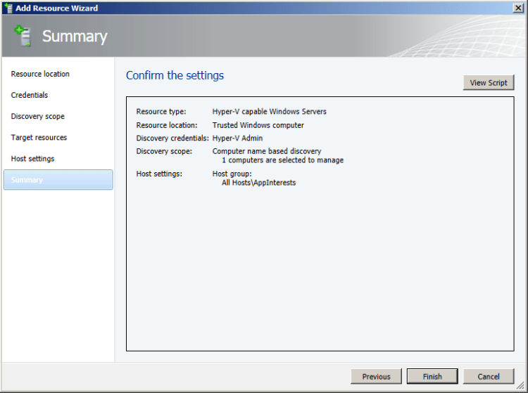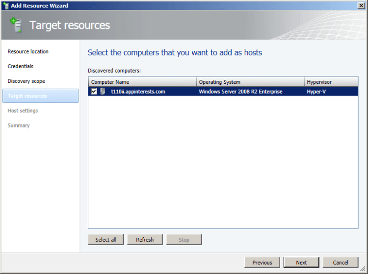 In the Target resources select all the discovered Hyper-V servers, and click Next.