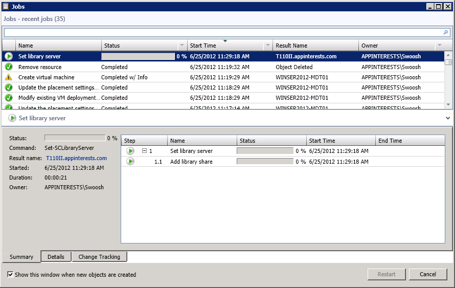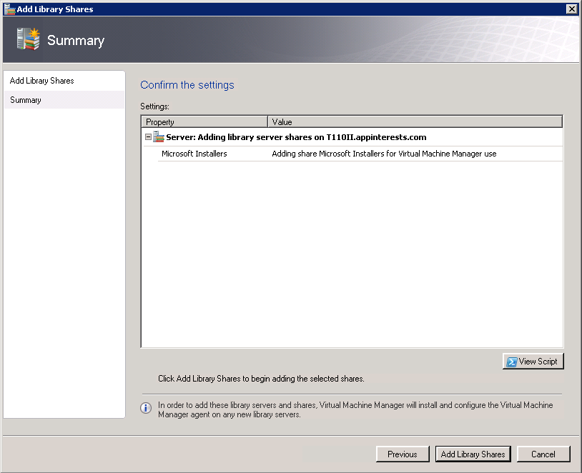You may want to take a look at the powershell script by clicking the View Script button. Once your confirm the settings are correct click the Add Library Shares button and it will create a set library server job.