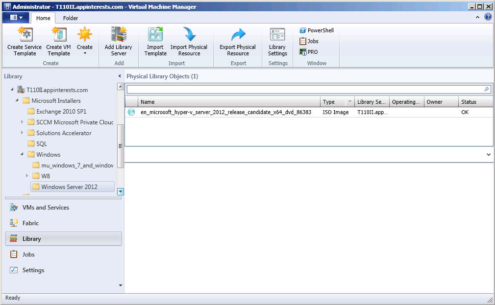 Once the job is done, you can now view the entire folder structure of your shared folder in SCVMM. Since the Windows installers are now added you are now ready to create a new Virtual Machine.