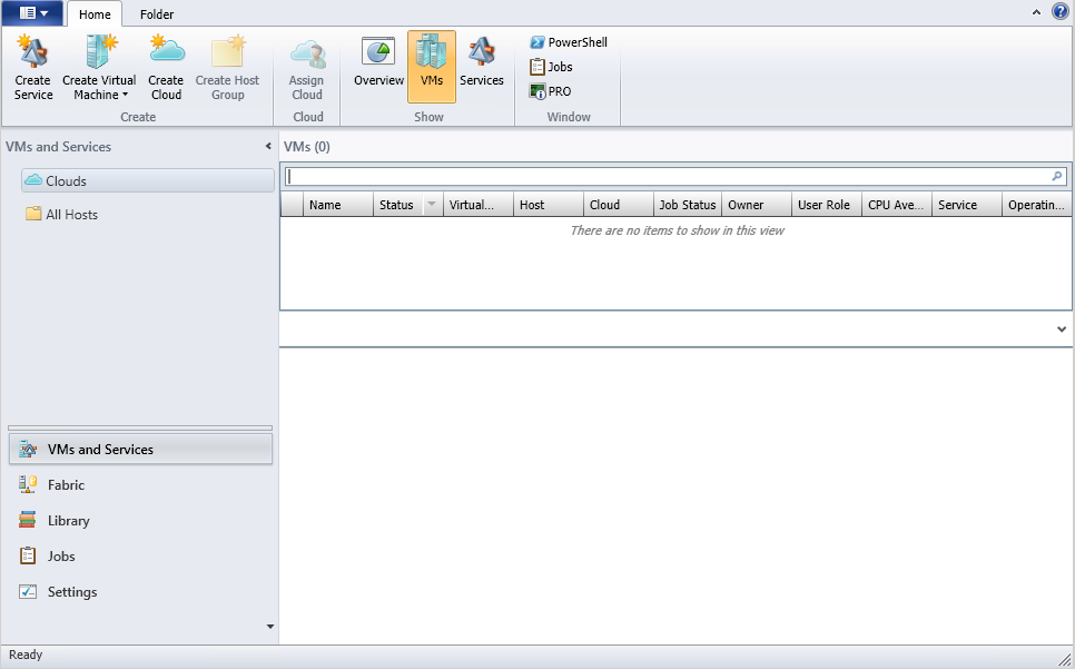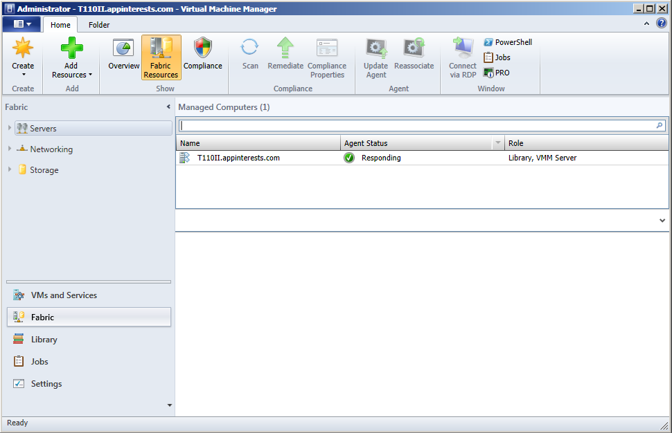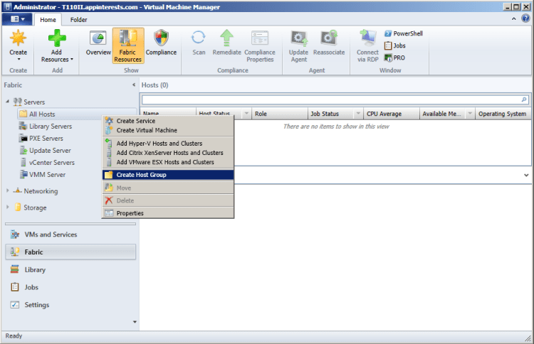 You are now ready to use SCVMM 2012. First Thing to do is add a host to manage. At the Home tab click on Fabric Resources.