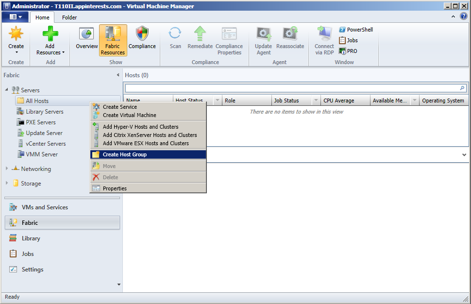 In the left pane of the console’s folder list, Right click on All Host and select Create Host Group and give your custom host group a name (in this example AppInterests is used).