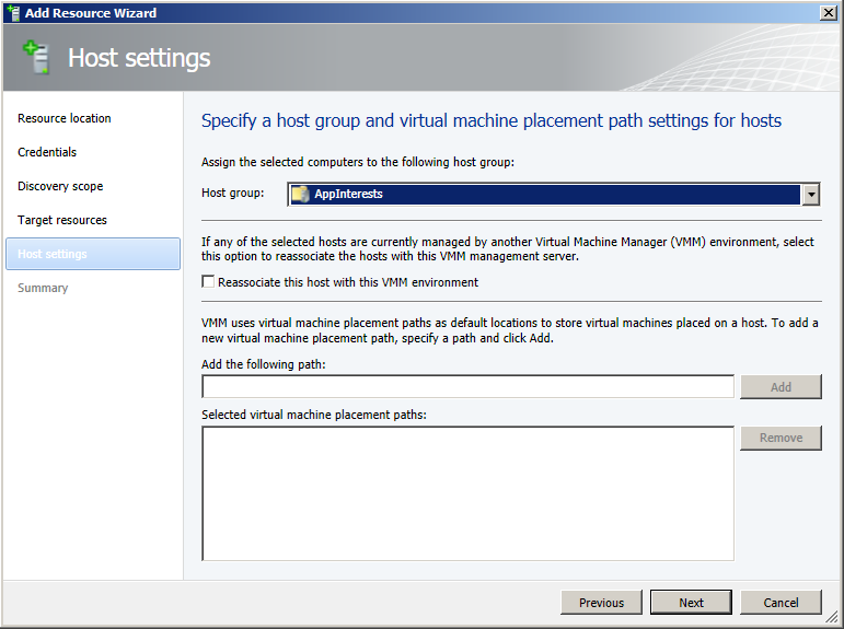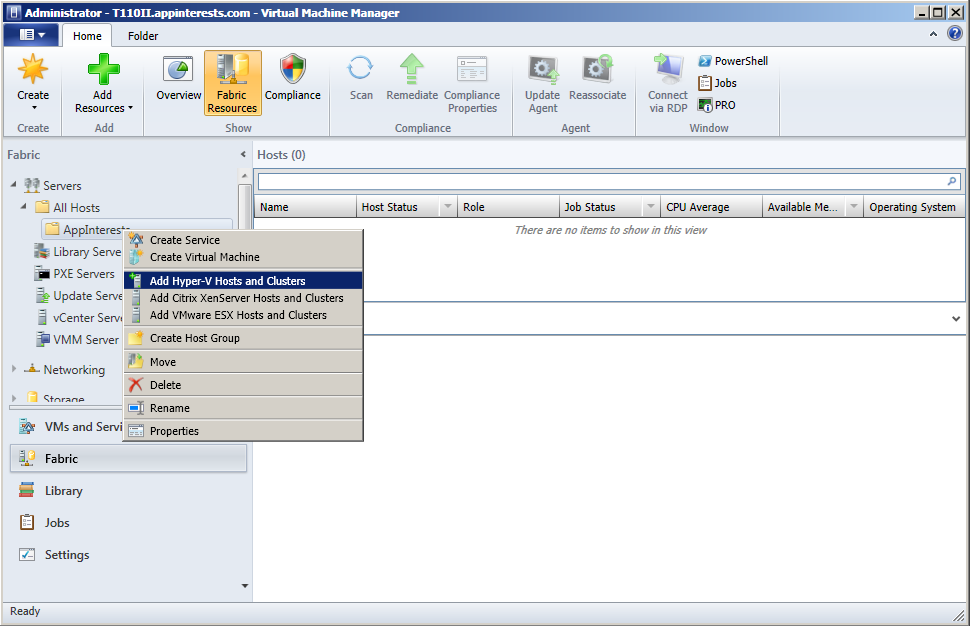 Next is to make a right click the host group and select “Add Hyper-V hosts and Clusters” then the Add Resource Wizard will appear.