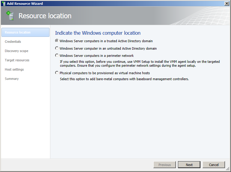 At the Resource Location screen, select Windows Server computers in a trusted AD domain and click next.