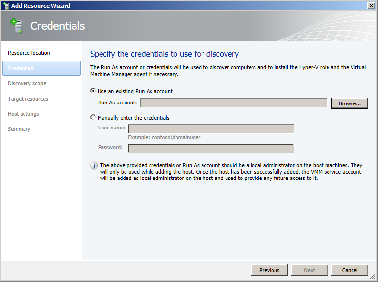 In the Credential’s screen, specify a credential to use for discovery click the Browse button.