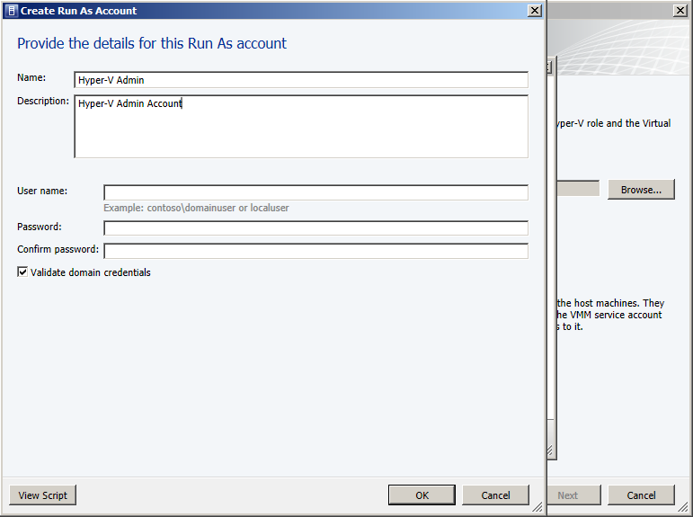 Enter a user name for your Hyper-V Administration Account and type in a password and click OK.