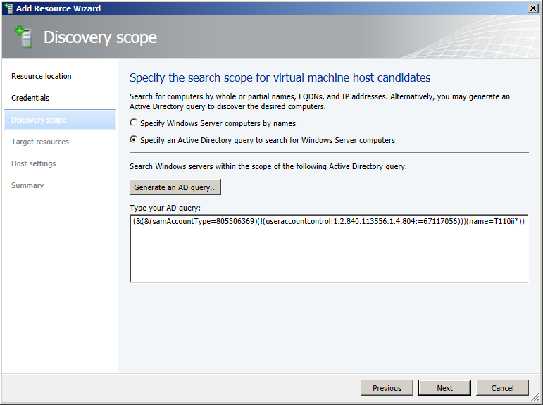In the Discover scope screen select then Specify an Active Directory query to search for Windows Server computers.