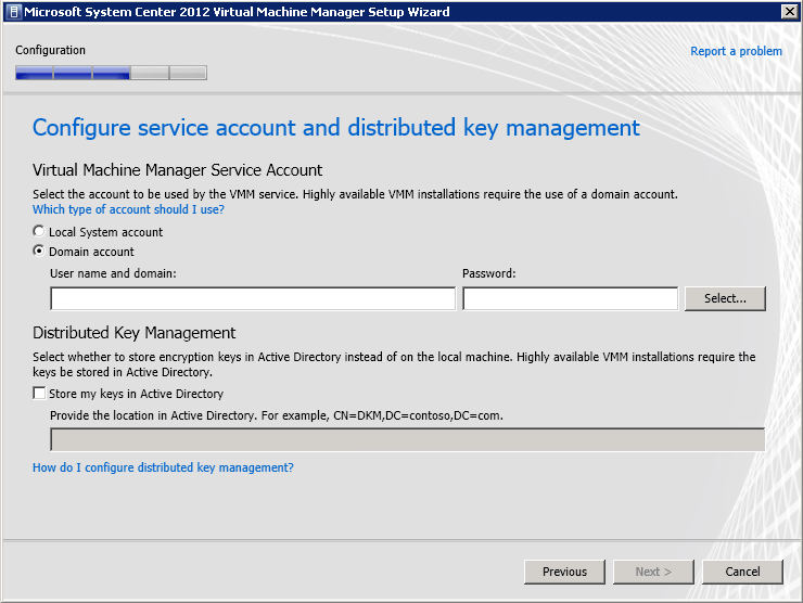 In the Account Configuration window, enter the domain account for the SCVMM service account you created earlier and under the Distributed Key Management, just leave it and click Next.
