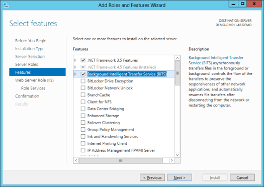 • Add Windows Features: NET Framework 3.5, Background Intelligent Transfer Service (BITS), Remote Differential Compression
