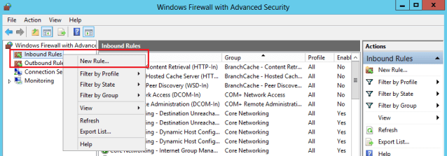 In the left pane of Windows Firewall with Advanced Security right-click Inbound Rules, and then click New Rule.