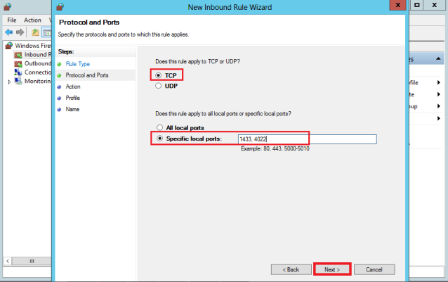 In the Protocol and Ports dialog box, select TCP. Select Specific local ports, and then type port numbers 1433 for SQL Server default instance and 4022 for Inter-site communications use the SQL Server Service Broker. Click Next.