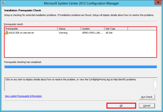 For this case we have a “Warning” status on “WSUS DSK on site server” this can be installed later. In some cases if you have under 8GB of RAM it will give you a “Warning on SQL Server process memory allocation“. Warning indicates that you need to fix things before the installing Config Manager. Click OK to close the window.