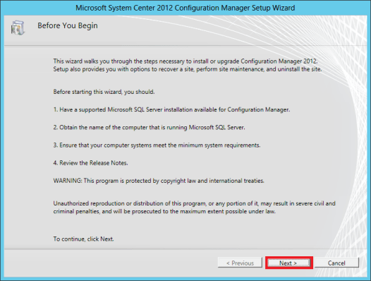 In the 1st page its basically reminding us to make sure we’ve met the minimum requirement for Config Manager 2012 installation, click Next.