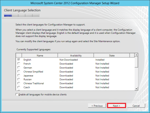 In the Client Language Selection leave the default selection unless other languages are required, click Next.