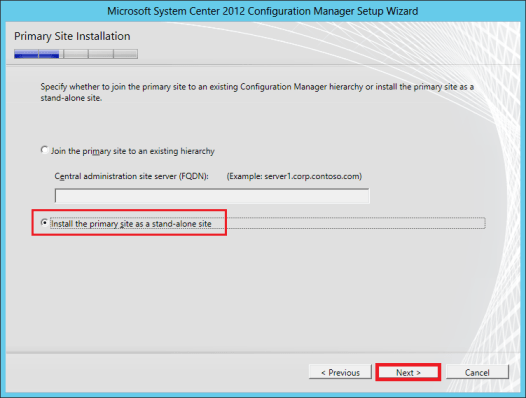 In the Primary Site Installation page, for lab purposes we will select Install the primary site to a stand-alone site by selection this, you will not be able to extend beyond one site.