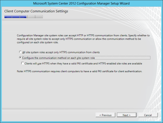 In the Client Computer Communication Settings, since we don’t have a fully functional PKI infrastructure we’ll select Configure the communication method on each site system role. Click Next.
