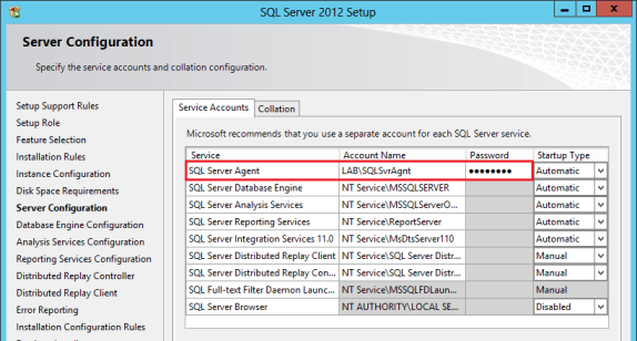 In the Server Configuration, Service Accounts tab, make sure to configure ALL SQL services to run under a domain user account (e.g., LAB\SQLSvrAgnt) instead of the local system or network services.