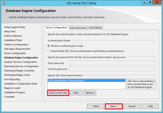 In the Database Engine Configuration, click Add Current User and click Next.