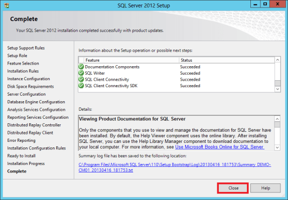 Confirm that SQL Server 2012 is successfully installed and click the Close button.