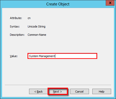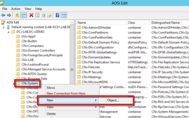 In the left pane, browse the Default naming context > expand DC and look for CN=System > make a right-click > in the context menu select New > Object…
