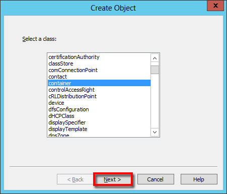 In the Create Object window, scroll and select container and click Next.