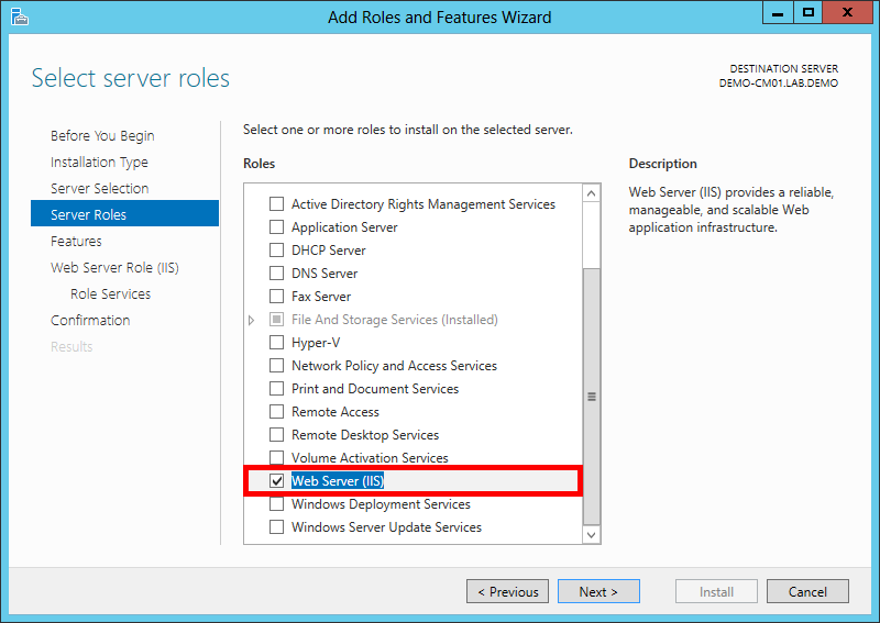 Step 4. Install Web Server (IIS) Role and other Features in DEMO-CM01.