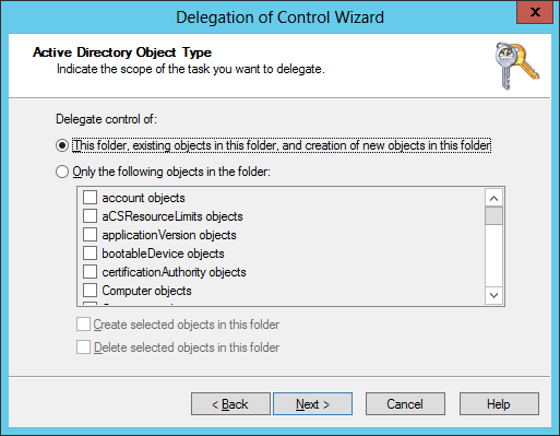 In the Active Directory Object Type select This folder, existing objects in this folders, and creation of new objects in this folder and click Next.