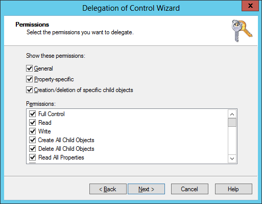 Tick on the 3 permissions General, Property-specific and Creation/deletion of specific child objects. Under Permissions tick on Full Control and click Next.