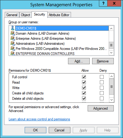 Verify that DEMO-CM01 permission is full control, in Active Directory, right-click the System Management and select properties.