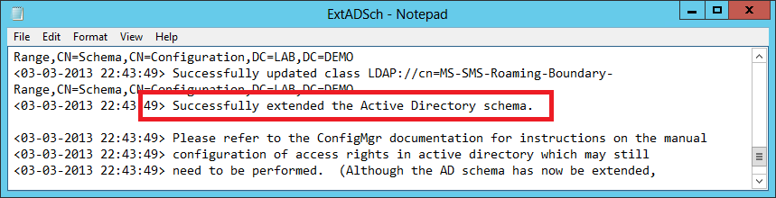 Back in DEMO-DC01 in the root directory, you’ll see a small text file ExtADSch.txt and when you open it, you’ll find the line: Successfully extended the Active Directory schema.