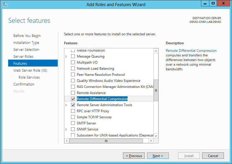 • Add Windows Features: NET Framework 3.5, Background Intelligent Transfer Service (BITS), Remote Differential Compression
