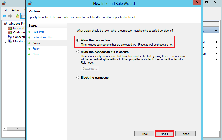 In the Action dialog box, select Allow the connection, and then click Next.