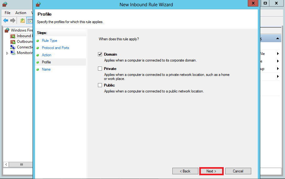In the Profile dialog box, select Domain and then click Next.