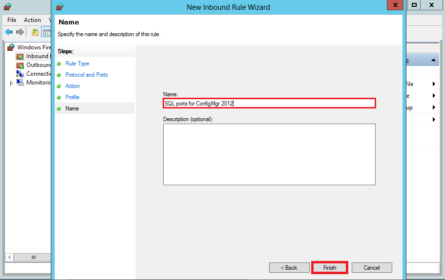 In the Name dialog box, type a profile name such as SQL ports for ConfigMgr 2012 and then click Finish.
