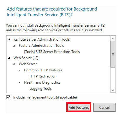 When prompted to “Add features that are required for Background Intelligent Transfer Service (BITS)?” click the Add Features button.