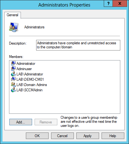 Add LAB\SCCMAdmin, LAB\DEMO-CM01 and LAB\Administrator to the local Administrators group.