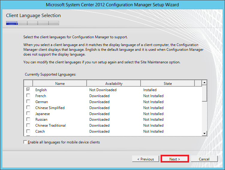 In the Client Language Selection leave the default selection unless other languages are required, click Next.